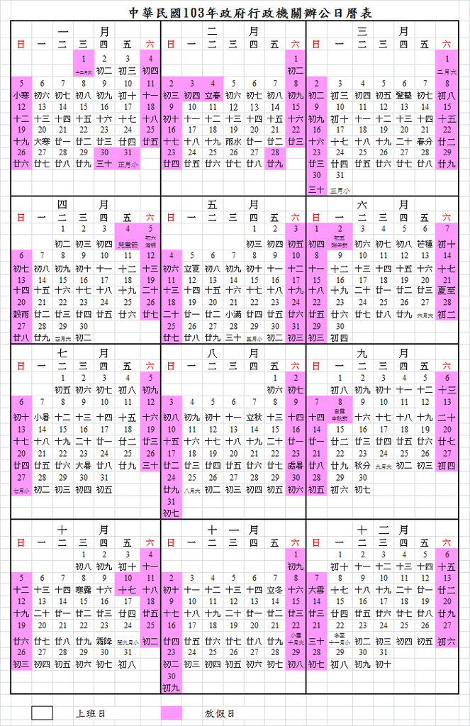 2014農民曆 2014年曆 2014年政府行政機關辦公日曆表 中華民國103年政府行政機關辦公日曆表