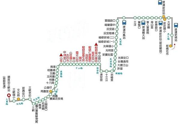 三峽老街(民生街)-國立教育研究院- 三樹路口-柑園-山佳[車站]-樹林區衛生所-樹林後火車站- 光華國小-民安路-捷運丹鳳站-捷運輔大站-捷運新莊站(新莊郵局)-捷運新埔站→板橋花市 |